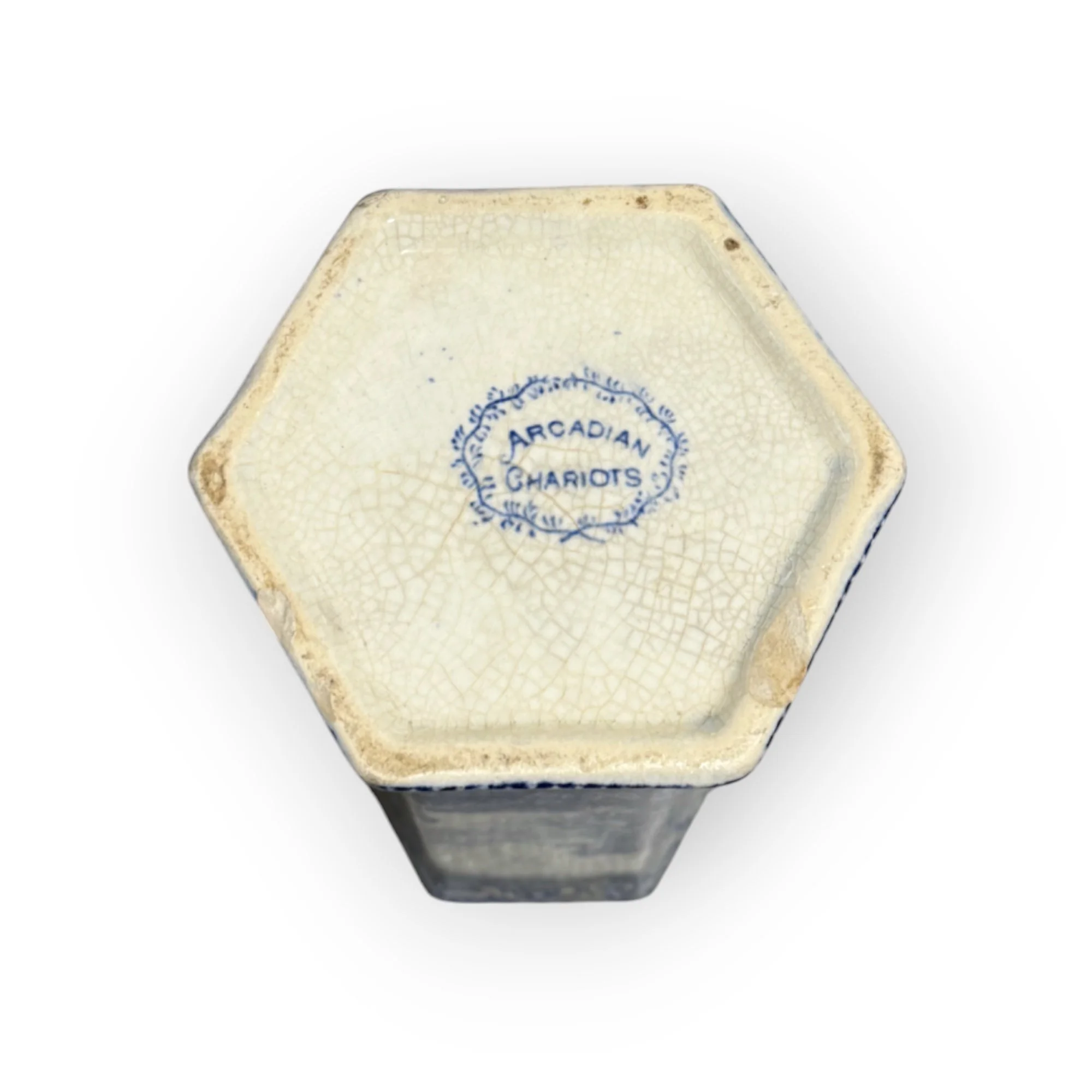 Crafted in the United Kingdom during the turn of the century, this antique blue transfer ware vase is a genuine piece of historical elegance. It showcases the intricate 'Arcadian Chariots' pattern, which wraps around the vase with a timeless charm, synonymous with the period's aesthetic. With dimensions of 16cm in height and 7.5cm in diameter, it's a modest yet captivating addition to any collection. The vase is fashioned from high-quality ceramic/porcelain, typical of the craftsmanship from the era. Its original state preserves the authenticity of its antique status, making it a prized item for enthusiasts or a charming decorative piece for those who appreciate the beauty of yesteryear's ceramics.